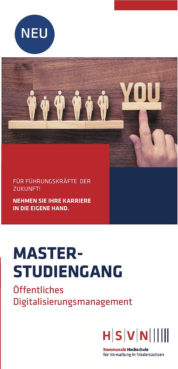 (15.12.21) Die HSVN - Kommunale Hochschule für Verwaltung in Niedersachsen bietet im kommenden Jahr einen Masterstudiengang „Öffentliches Digitalisierungsmanagement“ als weiterbildender, berufsbegleitender Fernstudiengang mit Präsenzphasen an. Ziel des Masterstudiums ist es, die Absolvent:innen für Führungsfunktionen mit Digitalisierungsschwerpunkt in der öffentlichen Verwaltung und in öffentlichen Unternehmen zu qualifizieren. Die insgesamt 14 Pflicht- und 5 Wahlpflichtmodule behandeln Themen aus den Gebieten der öffentlichen BWL sowie soziotechnische und rechtswissenschaftliche Inhalte. Das Weiterbildungsangebot ist als Bildungsurlaub anerkannt. Den Flyer zum Masterstudium können Sie hier (pdf, 701.3 KB) herunterladen.