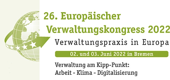 (05.05.2022) Die Pandemie, der Klimawandel und die Digitalisierung verändern die Lebens- und Arbeitswelten in erheblichem Maße. Gerade die Digitalisierung, kann ein bedeutsamer Beitrag auch zur Rettung des Klimas sein, wenn die Konsequenzen aus der Schwachstellenanalyse der Pandemie erkannt und umgesetzt werden. Es bedarf jetzt einer Weichenstellung. Der 26. Europäische Verwaltungskongress am 2. und 3. Juni 2022 in Bremen setzt sich mit der Frage auseinander, wie Verwaltung zu einem Treiber für Lösungen wird. Wie kann öffentliche Verwaltung in den Zukunftsthemen Arbeit, Digitalisierung und Klima handlungsfähiger, schneller und entschlossener werden, um unerwünschte bis gefährliche Entwicklungen zu verhindern? Der Kongress will in zahlreichen Vorträgen Antworten auf diese Fragestellung geben. Das ausführliche Programm und Informationen zur Anmeldung finden Sie in dieser Einladung zum 26. Europäischen Verwaltungskongress 2022 (pdf, 581.6 KB).