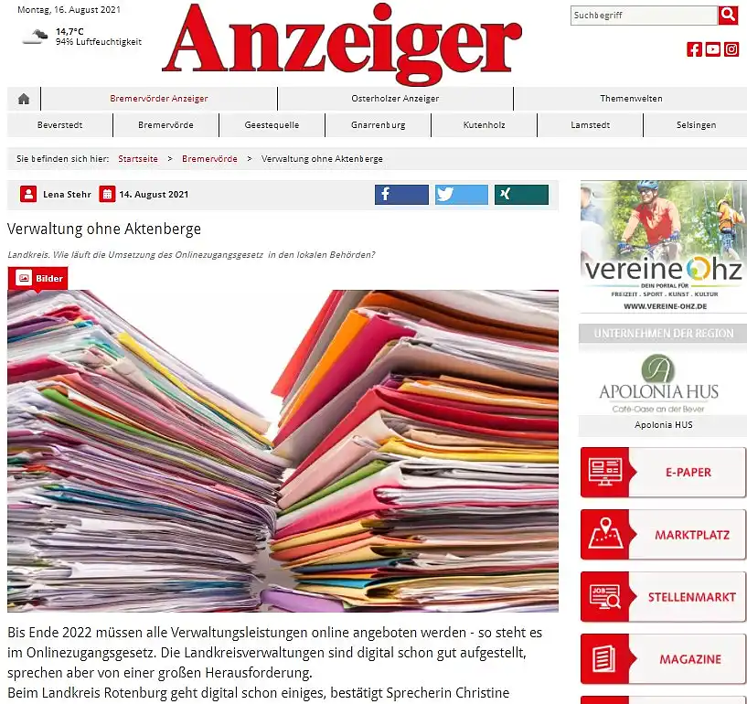 (16.08.21) Auch wenn die Verwaltungsdigitalisierung insgesamt nur schleppend vorankommt, Städte, Gemeinden und Landkreise in der ViR-Nordwest arbeiten intensiv an der Digitalisierung. Das macht ein aktueller Bericht im Lokalmedium Osterholzer Anzeiger deutlich. Das Ergebnis vorweg: Die Landkreise Rotenburg/Wümme und Osterholz arbeiten intensiv an der Digitalisierung und stellen sich für die digitale Welt auf. Der Osterholzer Anzeiger fragte in beiden Landkreisverwaltungen nach: Wie läuft die Umsetzung des Onlinezugangsgesetzes in den lokalen Behörden? Unter dem Titel „Verwaltung ohne Aktenberge“ findet man eine Zwischenbilanz der beiden ViR-Nordwest-Mitglieder. Den Bericht finden Sie hier.