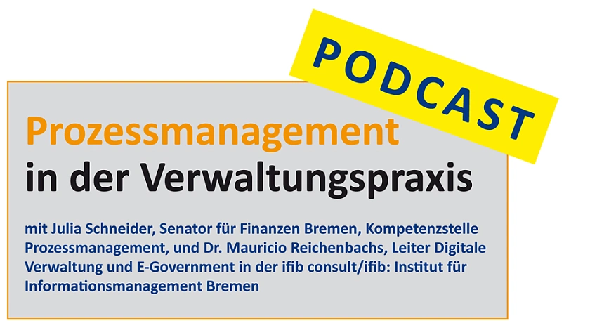 (29.03.2022) Aktuell ist der neue Podcast der Virtuellen Region Nordwest erschienen. Diesmal steht das Thema "Prozessmanagement in der Verwaltungspraxis" im Mittelpunkt. Gesprächspartner_in sind Julia Schneider, Senator für Finanzen Bremen, Kompetenzstelle Prozessmanagement, und Dr. Mauricio Reichenbachs, Leiter des Bereichs Digitale Verwaltung und E-Government in der ifib consult/ifib: Institut für Informationsmanagement Bremen mit den Schwerpunkten Prozessoptimierung und Digitalisierungsprojekte. Beide haben im letzten Jahr die AG Prozessmanagement der Virtuellen Region Nordwest geleitet und berichten über Ihre Erfahrungen aus der täglichen Prozessmanagement-Praxis, über Hürden für Prozessoptimierung, über Voraussetzungen für die Prozessoptimierung und über den Zusammenhang von Prozessmanagement und Digitalisierung.