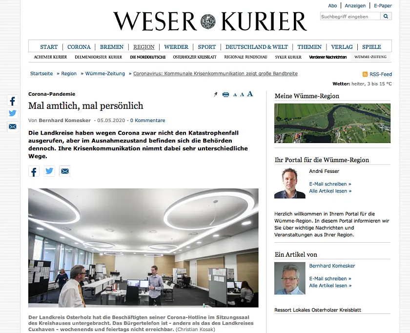 (06.05.2020) Ein aktueller Beitrag in der Wümme-Zeitung/Weser-Kurier stellt die Krisenkommunikation der Landkreise Cuxhaven und Osterholz- beide Mitglieder in der Virtuellen Region Nordwest - gegenüber. Aufgrund der Corona-Vorgaben des Bundes und der Landesregierungen sind die Landkreise nicht nur ausführende Organe, sondern sie tragen auch die Verantwortung für die Umsetzung zahlreicher Maßnahmen. Neben diesem großen Aufgaben-Feld zum Schutz der Bevölkerung obliegt den Landkreisen auch die Krisen-Kommunikation und -Information, die in den letzten Monaten in Einzelfällen bundesweit immer wieder Anlass zu Kritik gibt. Die Landkreise Cuxhaven und Osterholz kommunizieren offensiv, aber mit unterschiedlichen Herangehensweisen, wenn es darum geht, die Bürger/innen zu informieren und als Ansprechpartner für Fragen zur Verfügung zu stehen. Der Beitrag stellt grob das Vorgehen und die Unterschiede dar. Den vollständigen Artikel finden Sie unter diesem Link: Beitrag Wümme-Zeitung 06.05.20